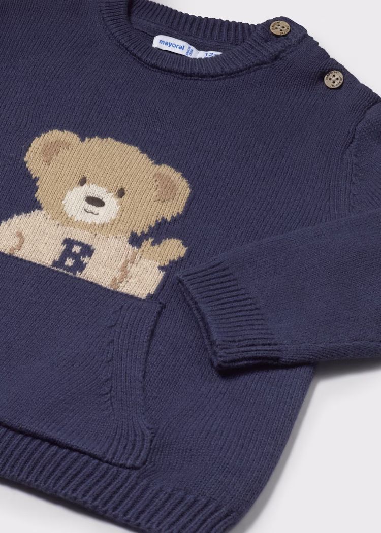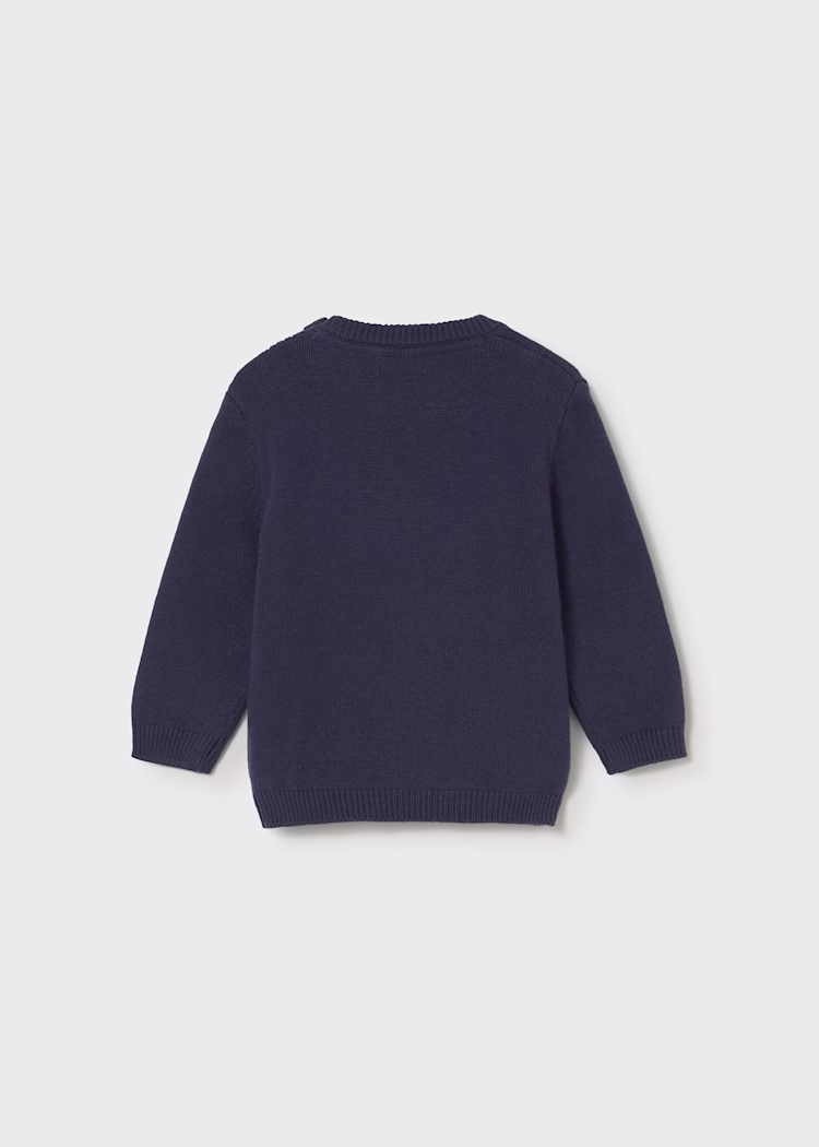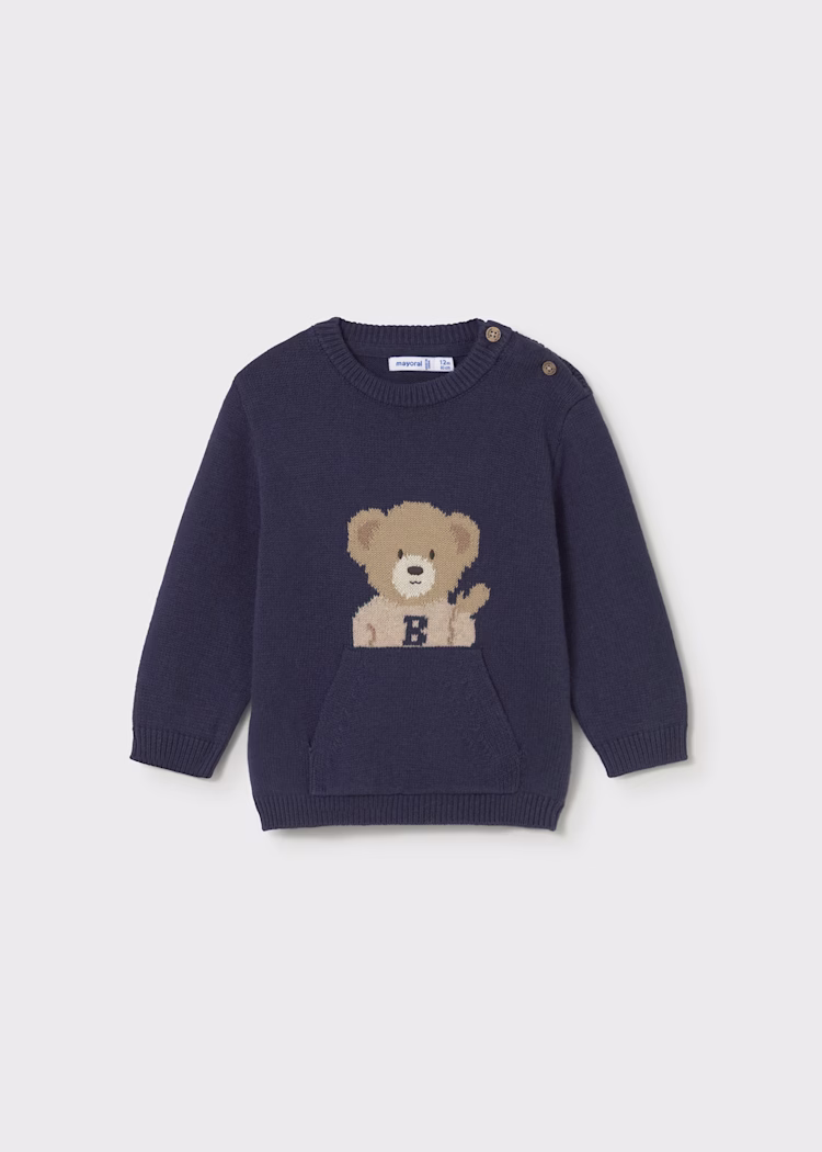 Langermet genser til baby fra Mayoral med rund hals og knappelukking på skulderen. Funksjonell lomme foran og med et søtt dekorativt bjørnemotiv som er brodert på.