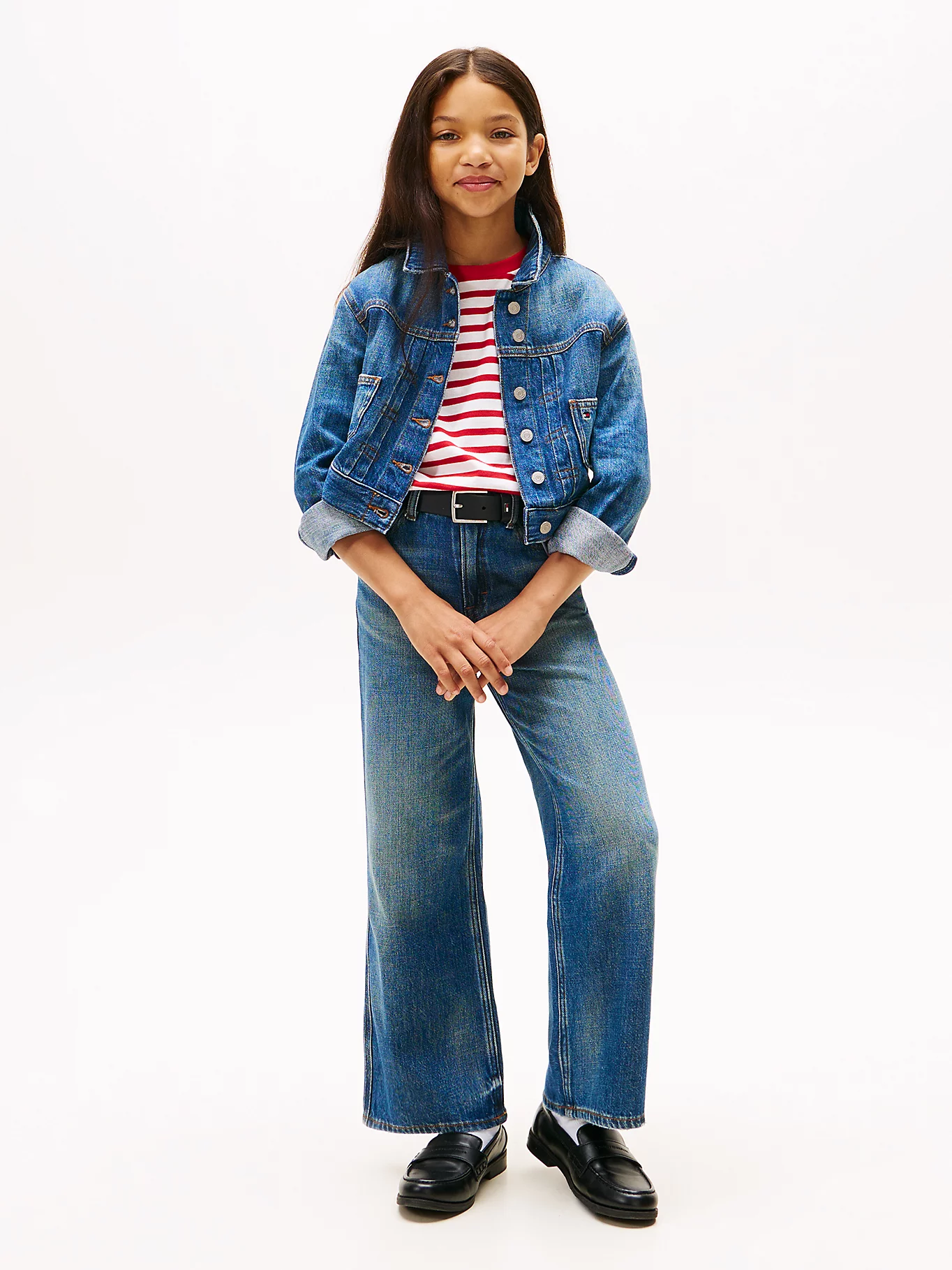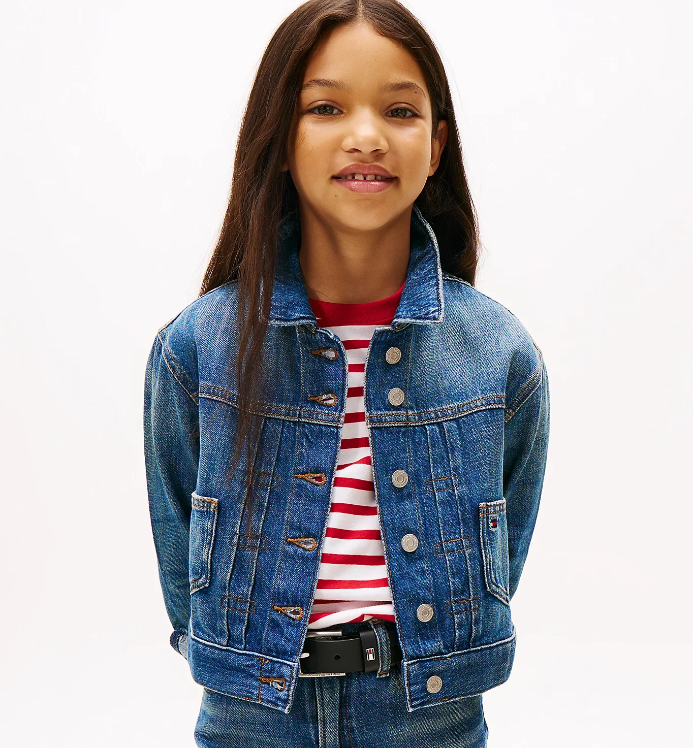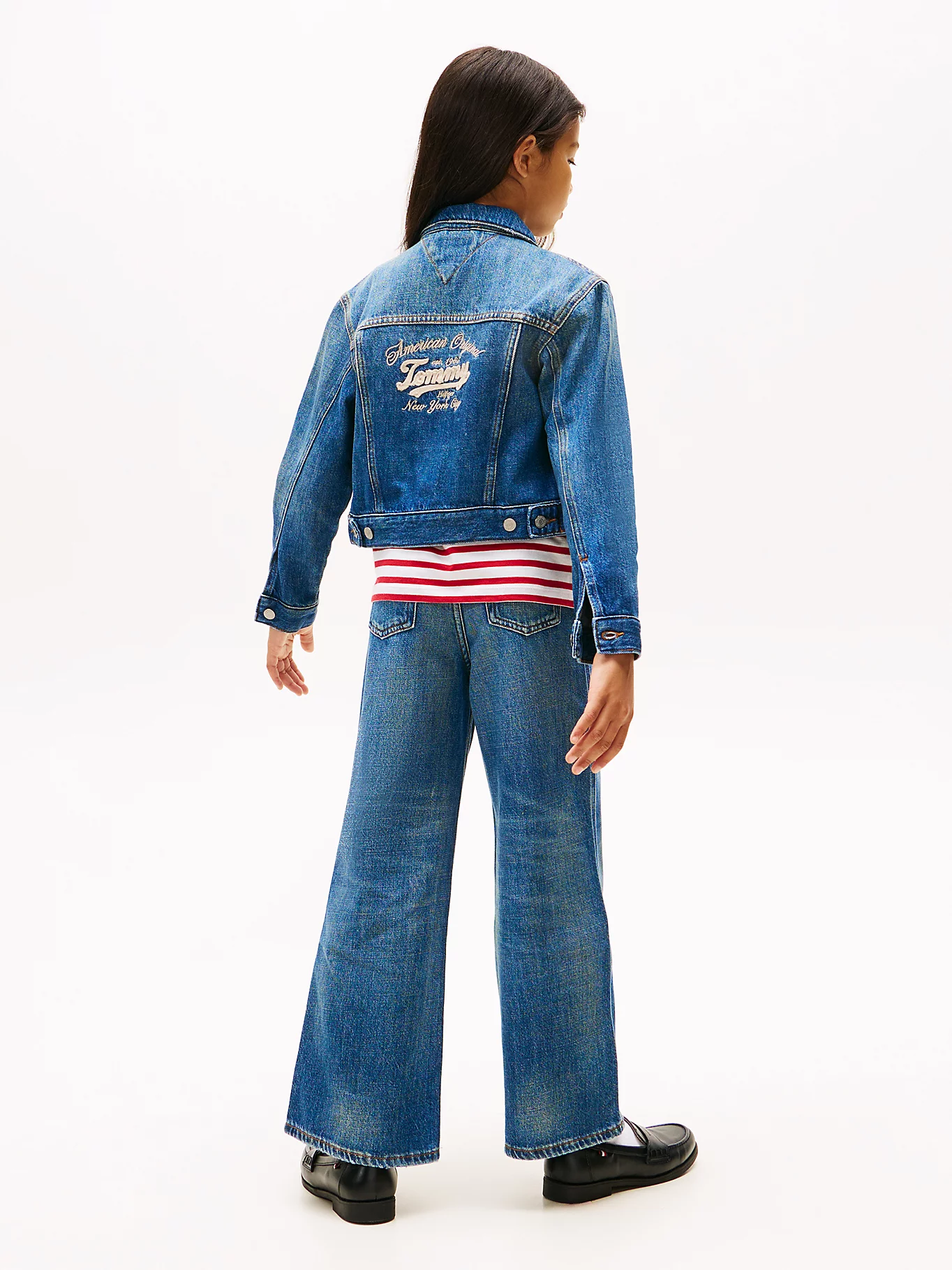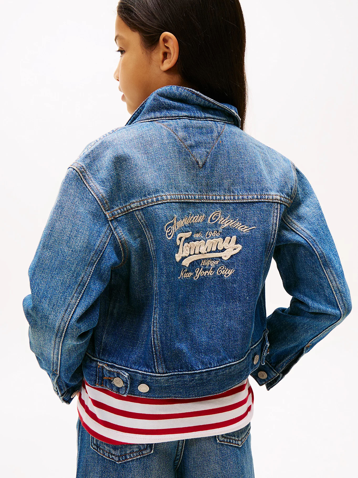 Denne denim-truckerjakken fra Tommy Hilfiger til jentene har heldekkende falming for en vintage-vibe og dristig logobroderi på baksiden.