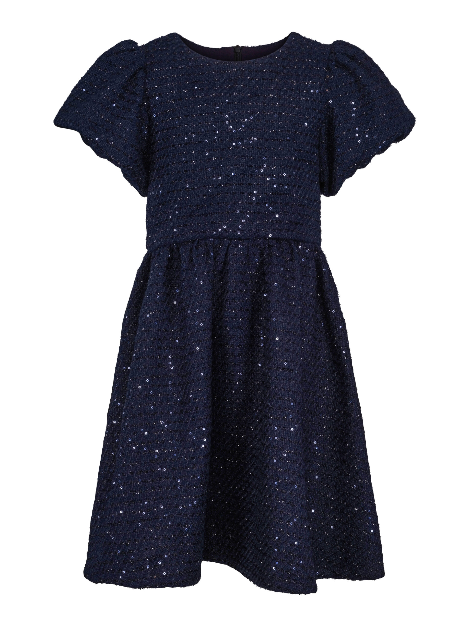 Elegant kjole i bouclé-stoff fra Vilje & Ve med store, dekorative puffermer og glitrende paljettdetaljer. Sofie-kjolen har en klassisk fasong og passer perfekt til høytider, selskaper og spesielle anledninger.