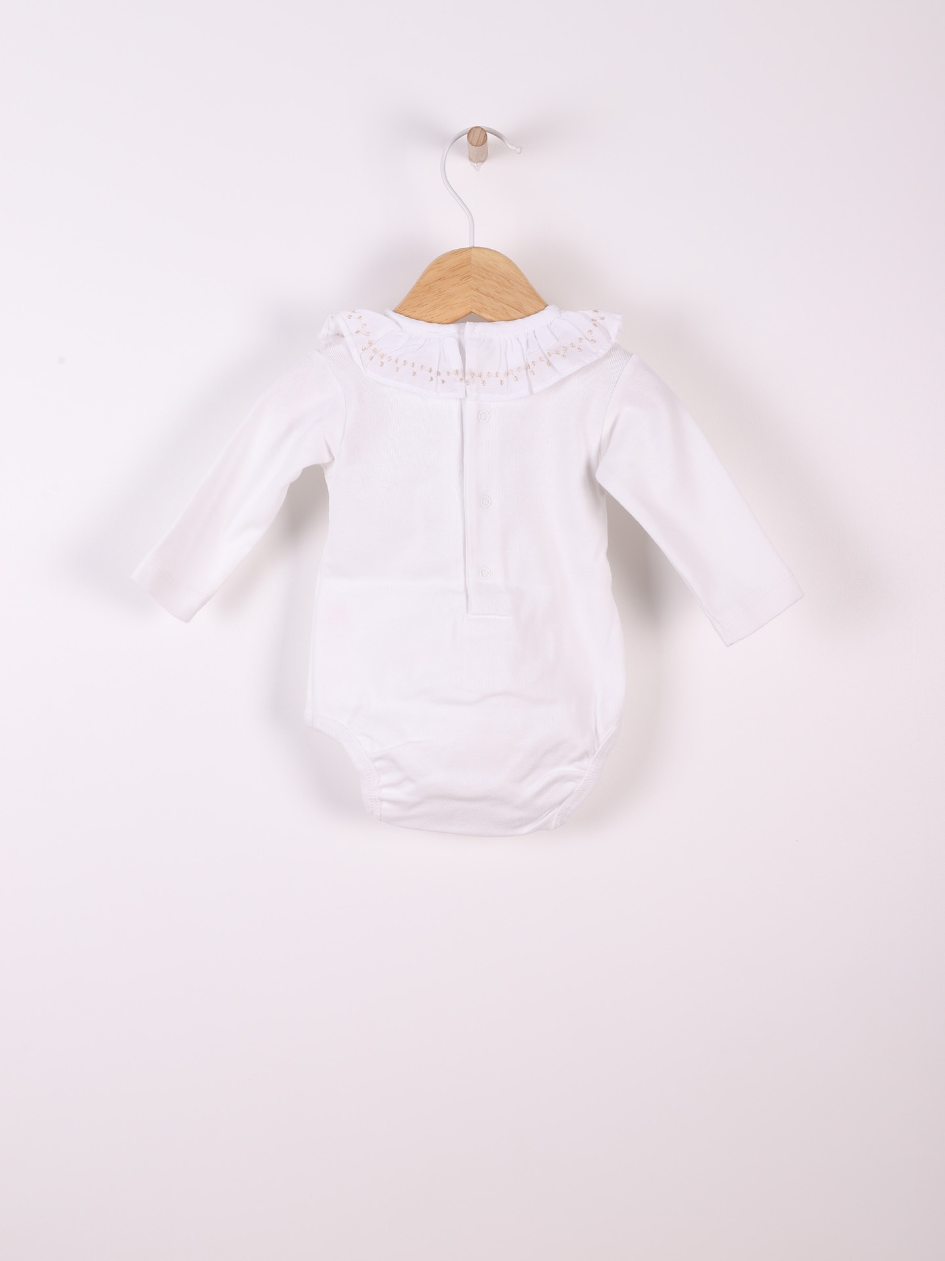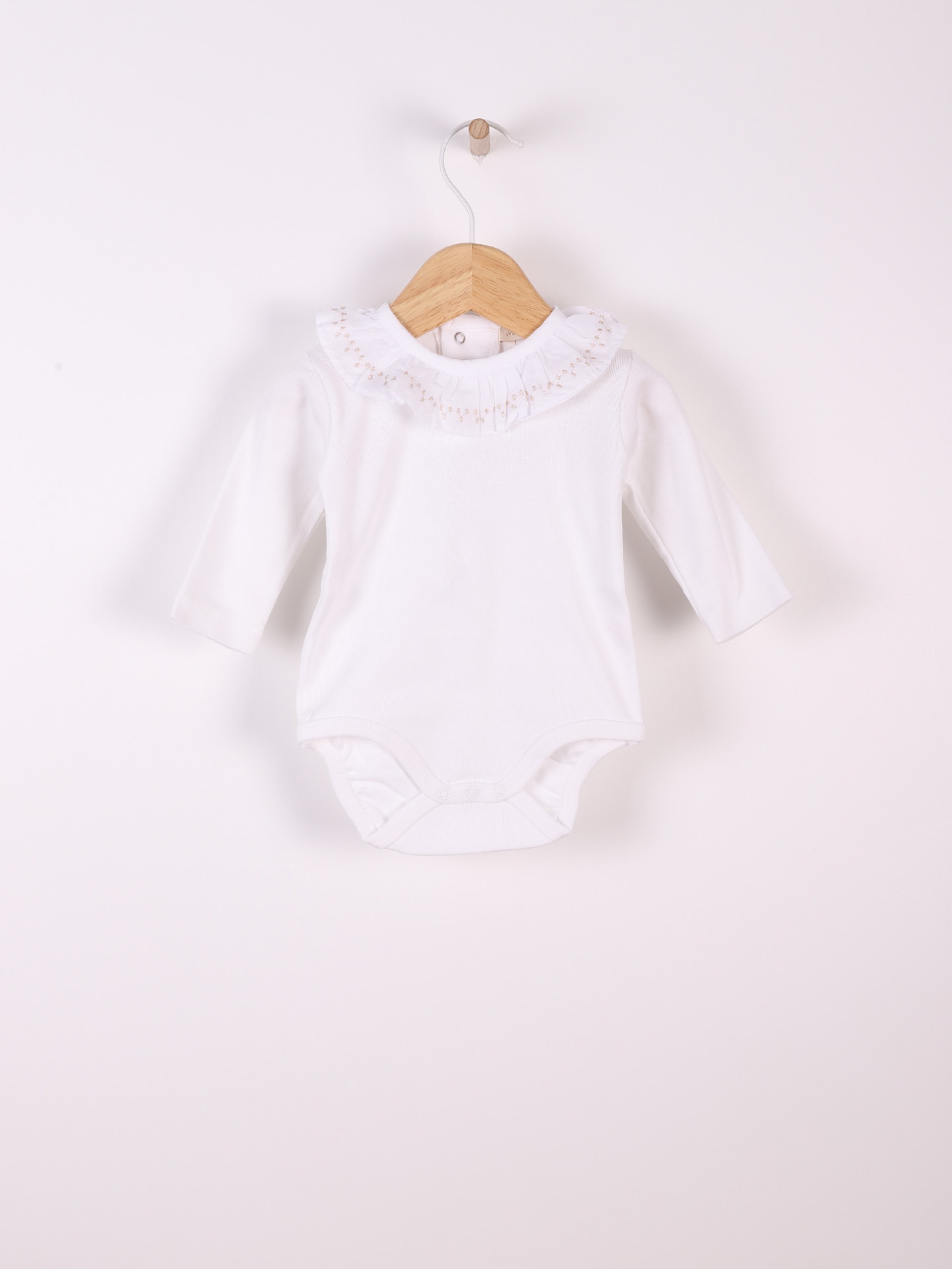 Klassisk langermet body fra Wedoble som er perfekt for babygutter og -jenter. SWEET BABY langermet rysjet body er laget i lett 100% bomull med brodert rysjekrage. Festes bak og mellom bena med trykknapper. Broderi er tilgjengelig i forskjellige farger.