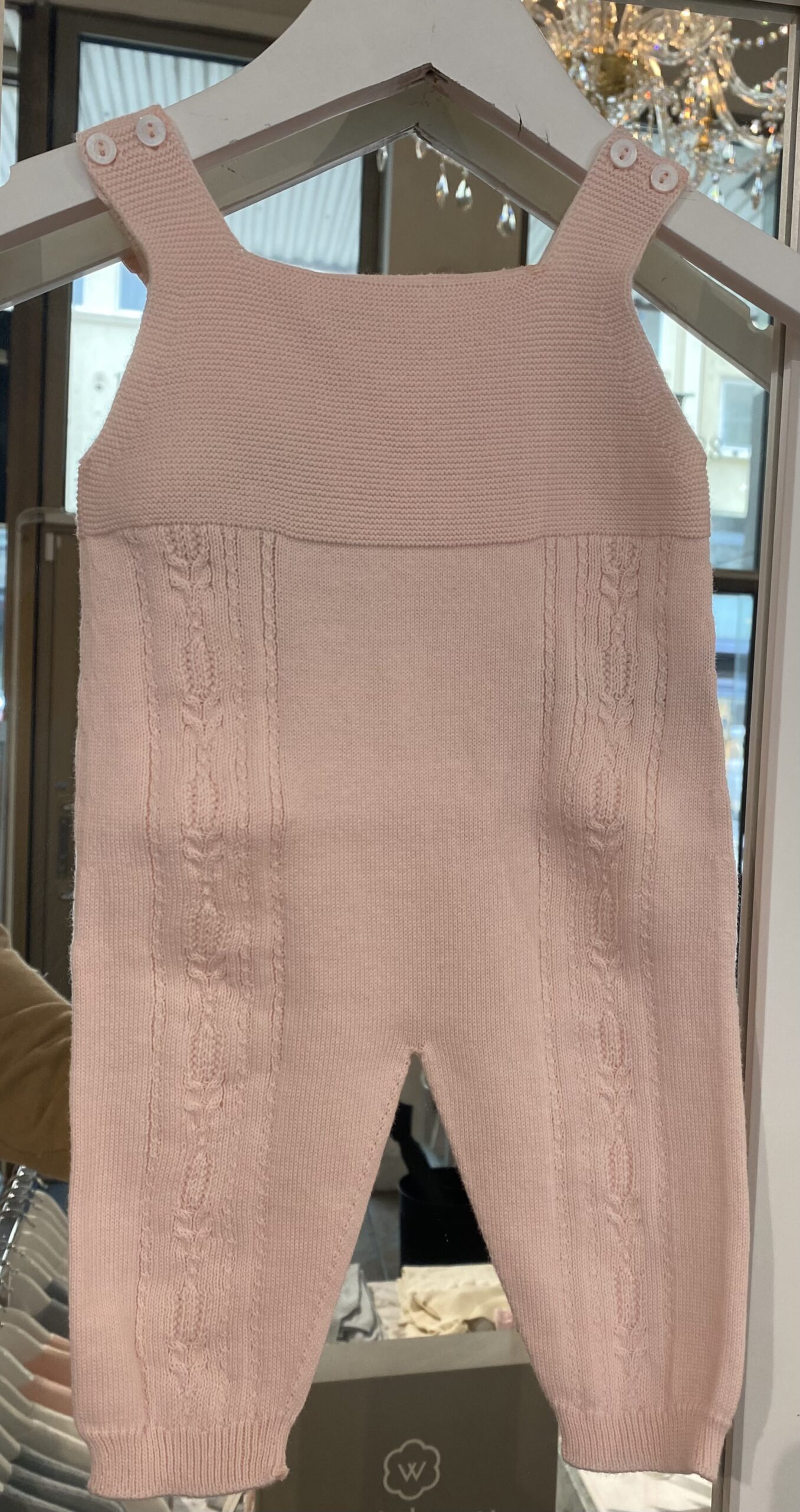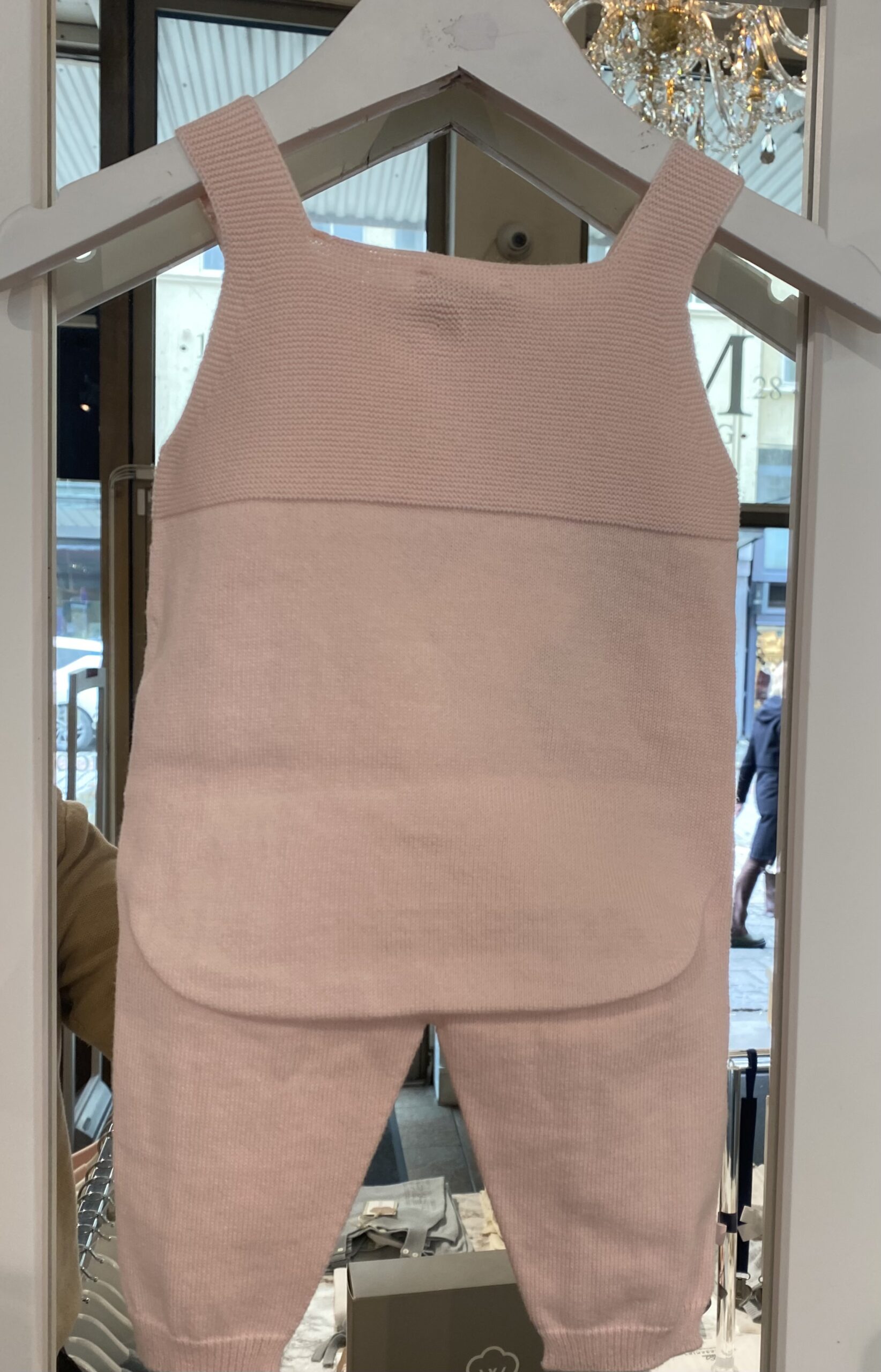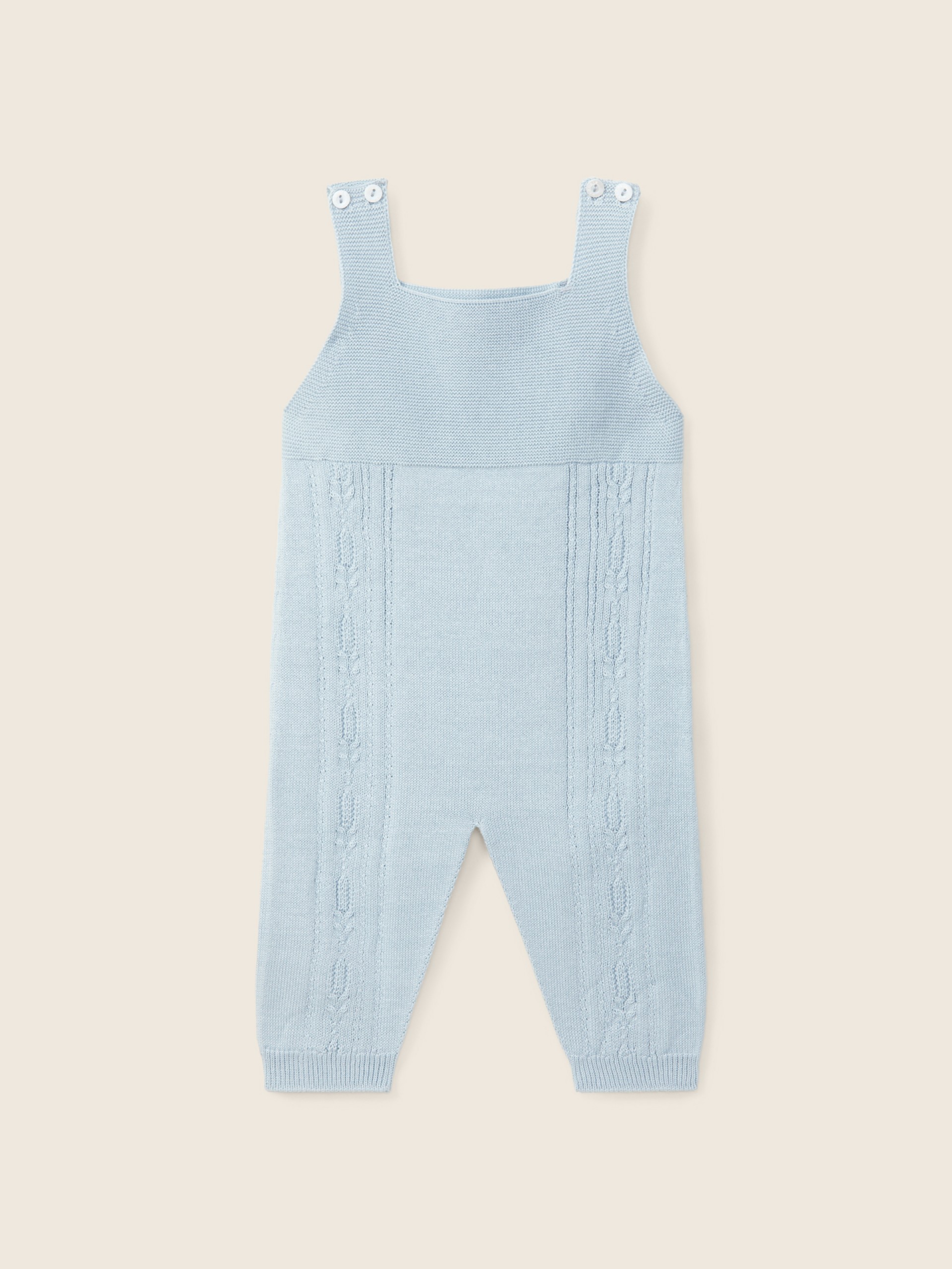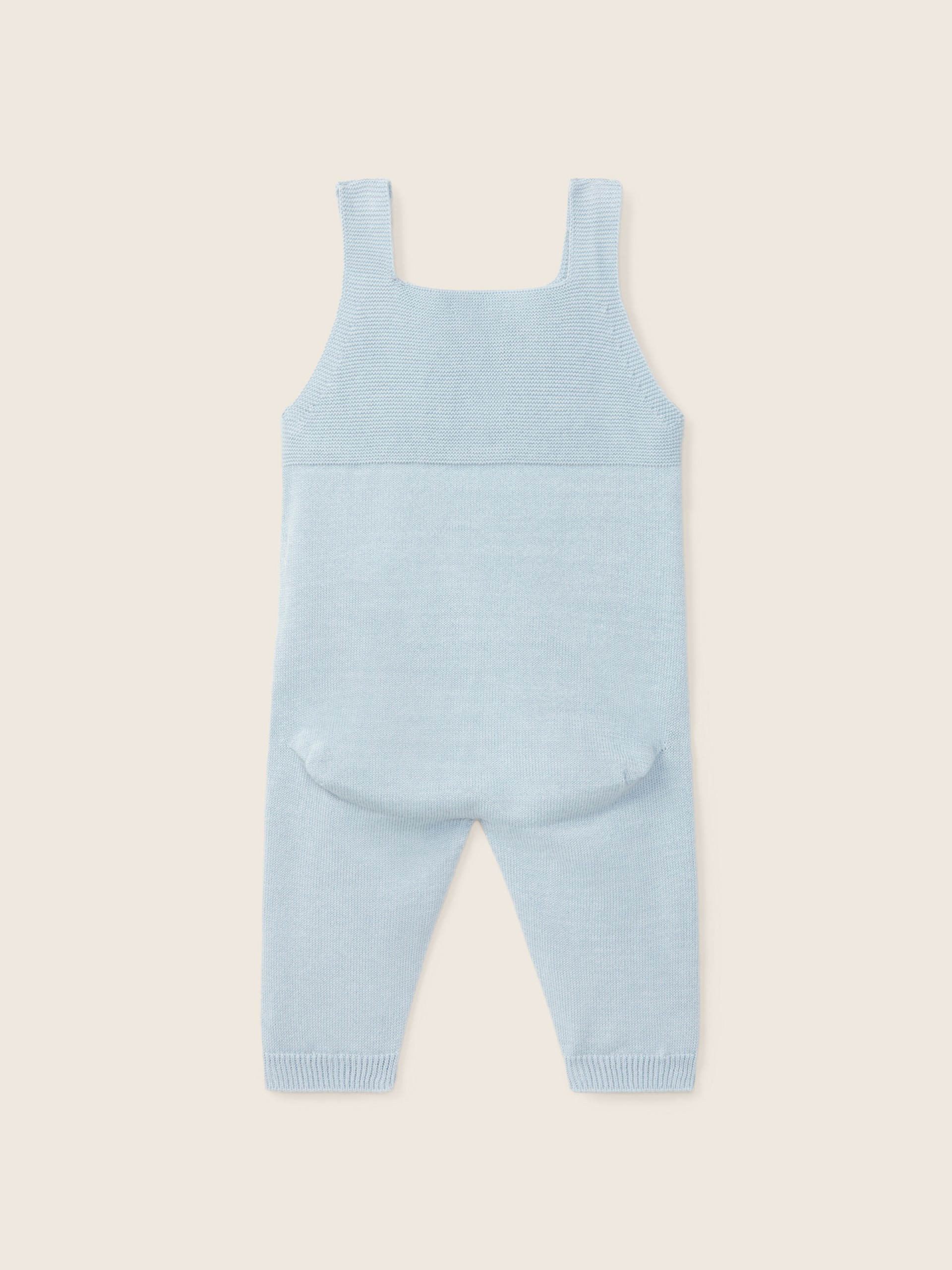 Skulderstroppet strikket selebukse fra Wedoble i fin netting av myk og pustende økologisk bomull. Plagget festes i stroppene med perlemorknapper over skulder. Produsert i helstøpt, sømløst stykke, for babyens maksimale komfort.